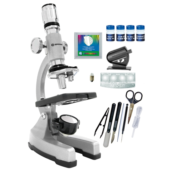 Einsteiger Mikroskop Set Biotar DLX stabiles Metall-Mikroskop für den Einstieg in die Mikroskopie mit umfangreichen ZubehörBeleuchtung Durchlicht über Spiegel oder batteriebetriebenes Lämpchen3-fach Objektiv mit 7,5 x 15 x und 30 x Vergrößerung möglich von 50x bis 1200xOkular 40 x im Aufbewahrungskoffer enthalten sind:ein kleines Präparierbesteck mit Pinzette, Schere, Skalpell, Schnittfänger und 1 Lupefür mikroskopische Übungen liegen bei: Mikrotom, Garneleneier, Bruttank, Hefe, Seesalz, 10 Objektträger und Deckgläschen, Projektor und 1 ErsatzglühbirneAlternativ kann das Mikroskop (inclusive dem Zubehör) auch kostengünstiger im Karton geliefert werden. Größe: Koffer Karton Art.Nr. Größe Preis 36250 Koffer 43.50 € 8851200 Karton 29.50 €